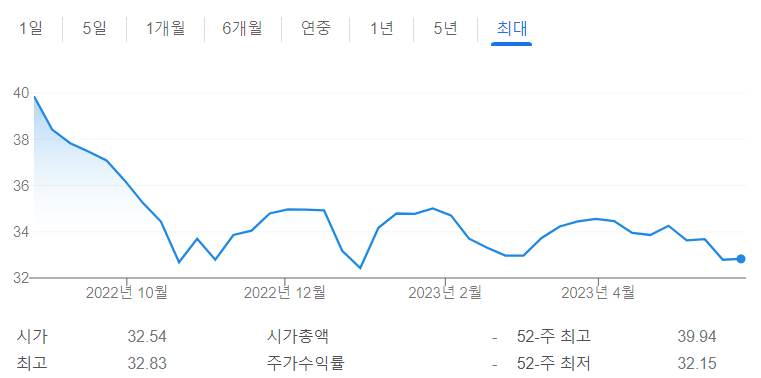 위 그래프에서도 보듯이 인플레이션을 잡기 위해 1년도 안 되는 시기에 0%에 가깝던 기준금리가 무려 5.25%까지 빠르게 상승한 상황입니다. 이러한 환경으로 인해 미국 장기채 ETF인 TLT 역시 좋지 않은 가격흐름을 보여주고 있는데요.