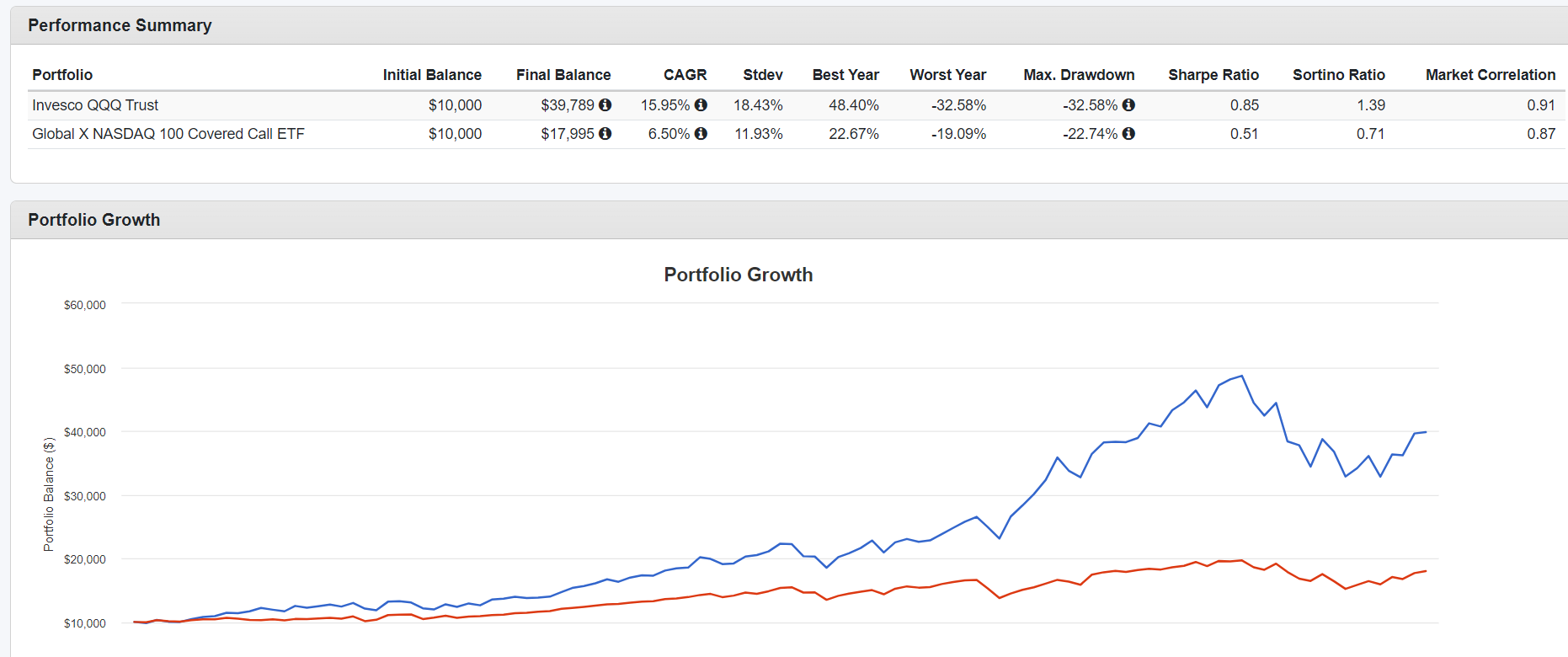 됨에 따라 지난 10년간 급격하게 상승한 나스닥 지수의 특성으로 인해 QQQ대비 상당한 언더퍼폼한 결과를 보여주고 있습니다. 여기에 운용보수 및 옵션 매매비용으로 인한 차이도 존재하고요.
