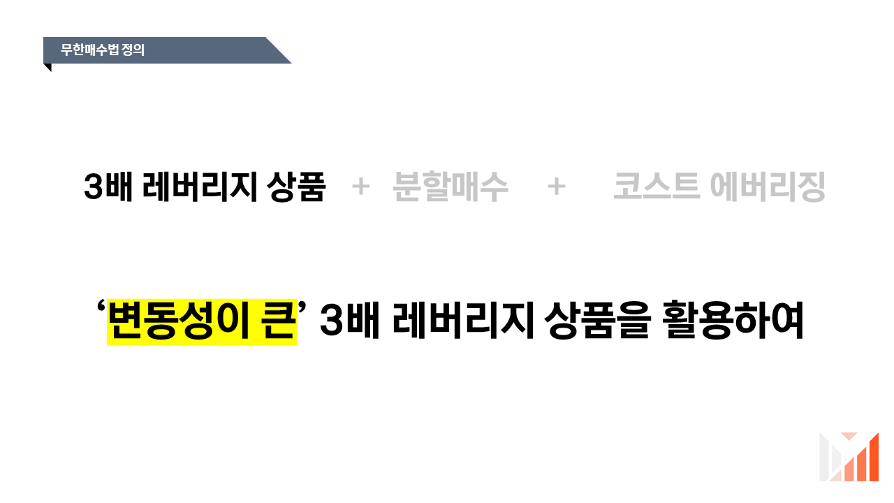라오어님의 무한매수법은 3배 레버리지 ETF의 변동성을 활용하여 투자하는 방법론 중 하나입니다. 어떤 종목을 언제 어떻게 사고 몇 프로에 매도해야 하는지까지 정의되어 있는 실전에 바로 적용 가능한 투자법이죠.